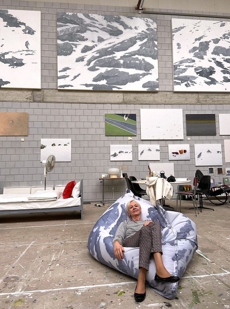 Das Loungekissen präsentiert sich unmittelbar vor dem Originalkunstwerk im Atelier.