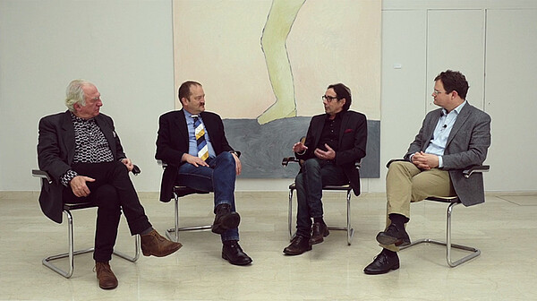Alois Lichtsteiner im Gespräch mit dem Kunstliebhaber Christian Cuénoud, Auktionator und Galerist Kuno Fischer und Heinz Stahlhut, Sammlungskurator des Kunstmuseums Luzern, Februar 2016.